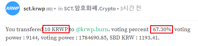 또한 3시간전 보팅 이력을 살펴봐도 같은 10krwp를 전송했어도 미세한 차이가 있음을 확인할 수 있다