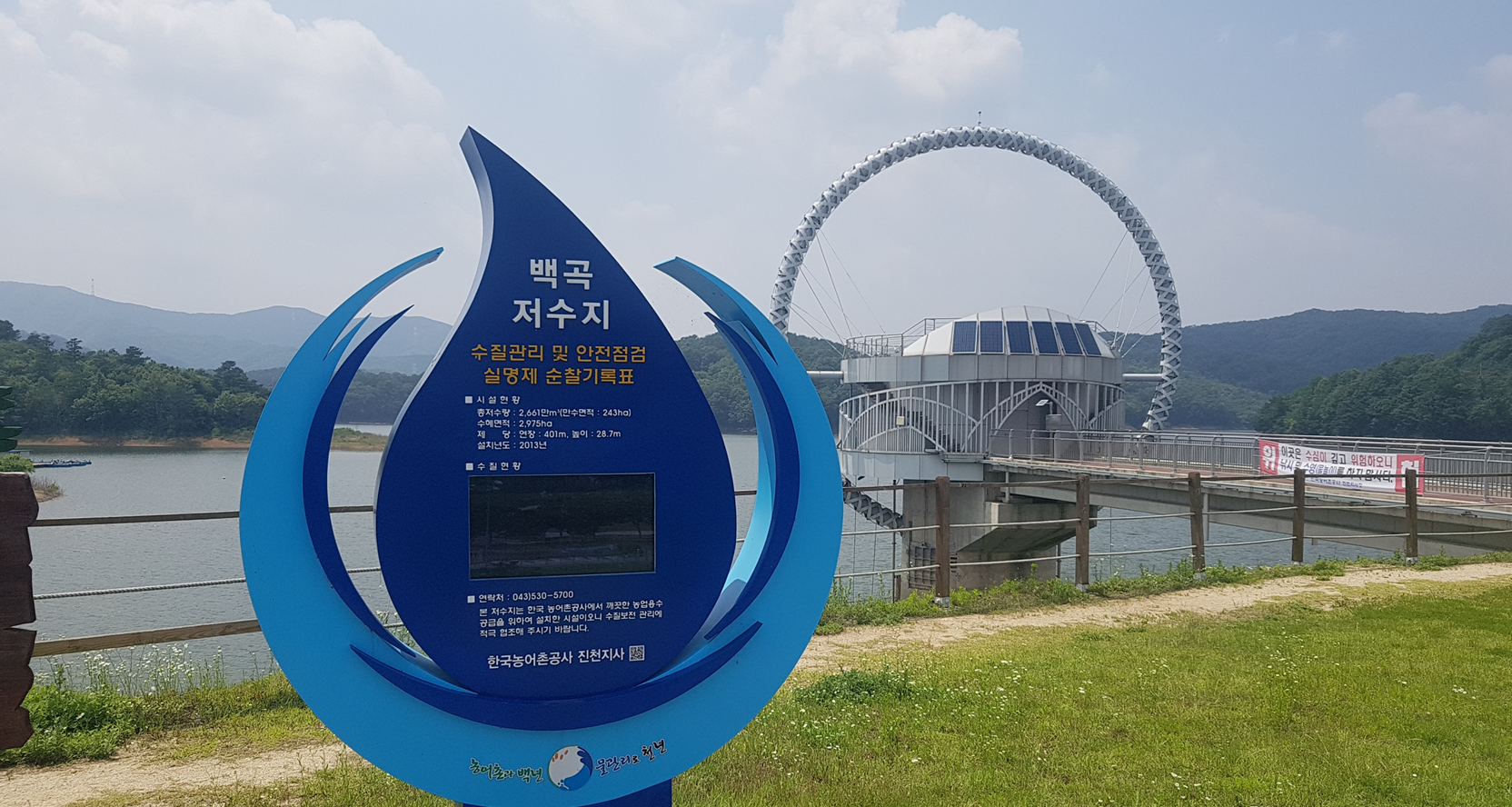 계단을 오르면 백곡저수지임을 알리는 조형물이 서있다