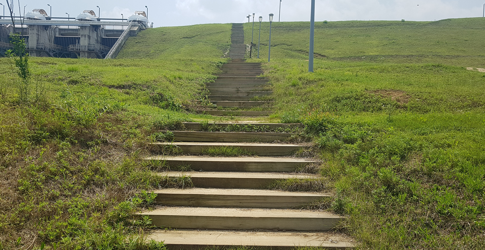 나무 계단을 밟고 제방위로 올라가야 하는데 무릎이 좋지 않아 이게 참 힘들다