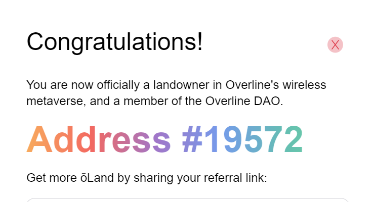 여기까지 잘 따라하셨다면 성공했다는 메세지를 확인할 수 있으며 2천평에 해당하는 랜드 주소도 부여 받게 됩니다