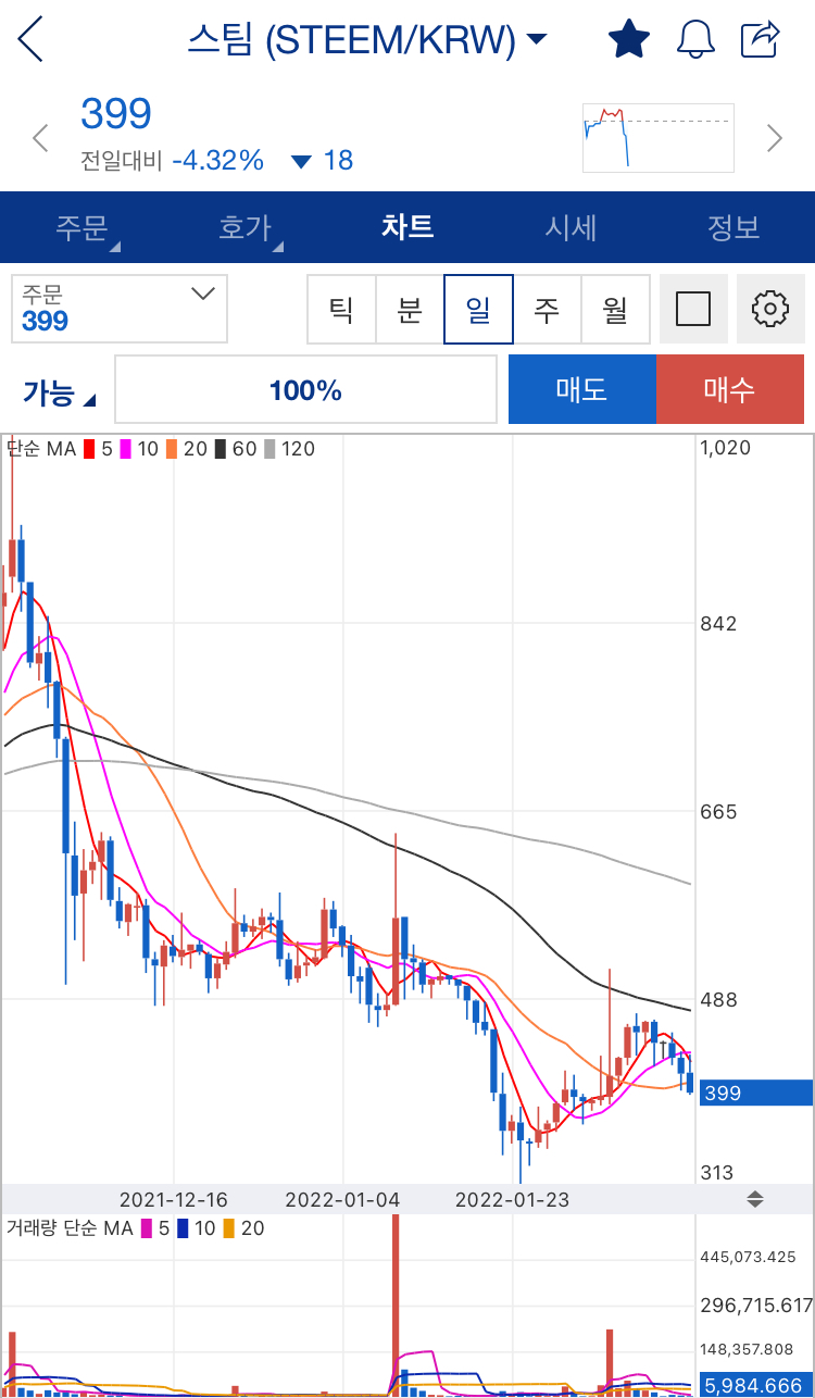 비트 하락에 스팀/스달도 맥을 못추고 스팀 400원이 살짝 깨져 버렸습니다.