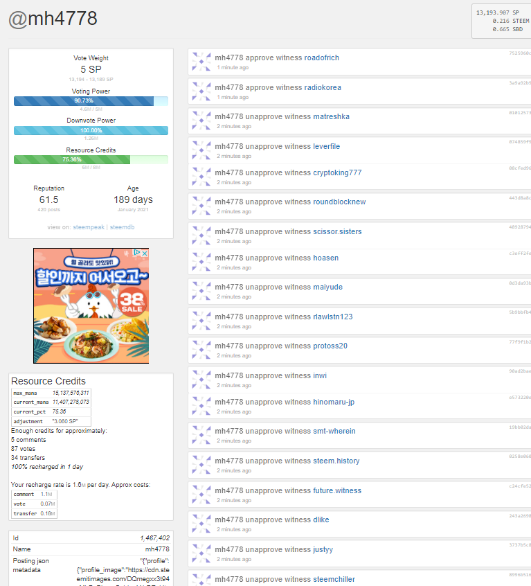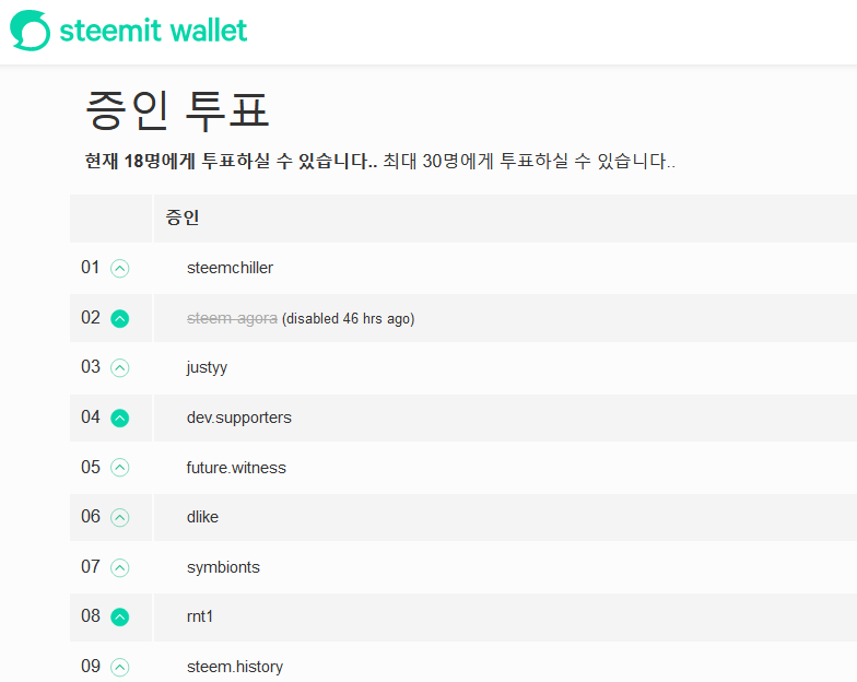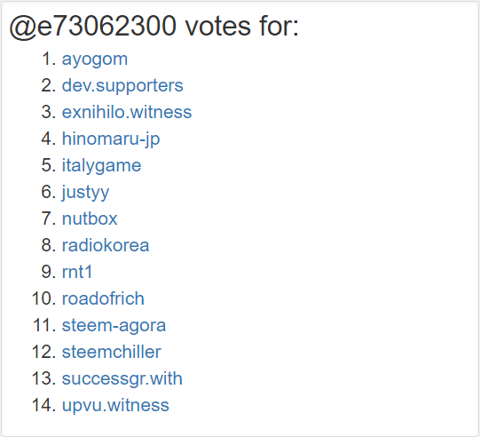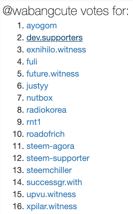 (방법 1 - 추천) https://steemd.com/@본인계정 으로 접속하셔서 화면을 쭈욱 내려보시면 어느 증인에 투표하고 있는지 나오실 겁니다.