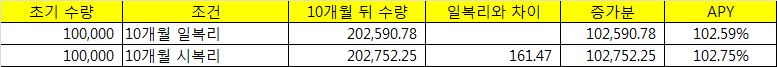 DeFi 수익률이 높은 이유는 바로 일복리 투자가 가능하다는 점입니다. 그럼 시복리로 투자를 하면 어떨까요? 여기서 시복리란 1시간마다 재투자를 하는 것을 말합니다.