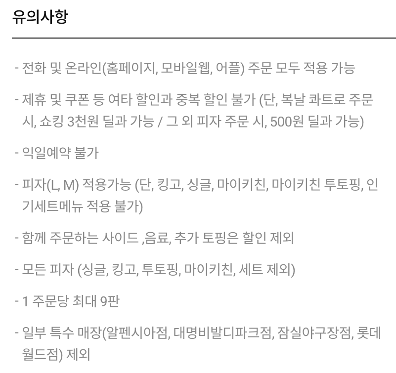 - 유의사항을 확인해보면 중복 할인 불가라는 점과 몇 가지 메뉴에 적용이 불가능한 점, 사이드,음료,추가토핑은 할인 제외된다는 점 외에는 주문을 하면서 크게 신경쓸 부분은 없어보이기도 합니다.