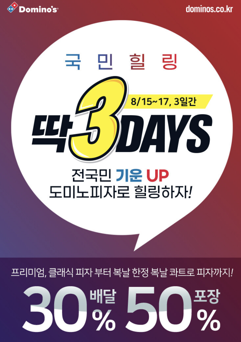 8/15~17, 총 3일간 도미노피자에서 포장주문 50% 할인 이벤트가 있습니다.