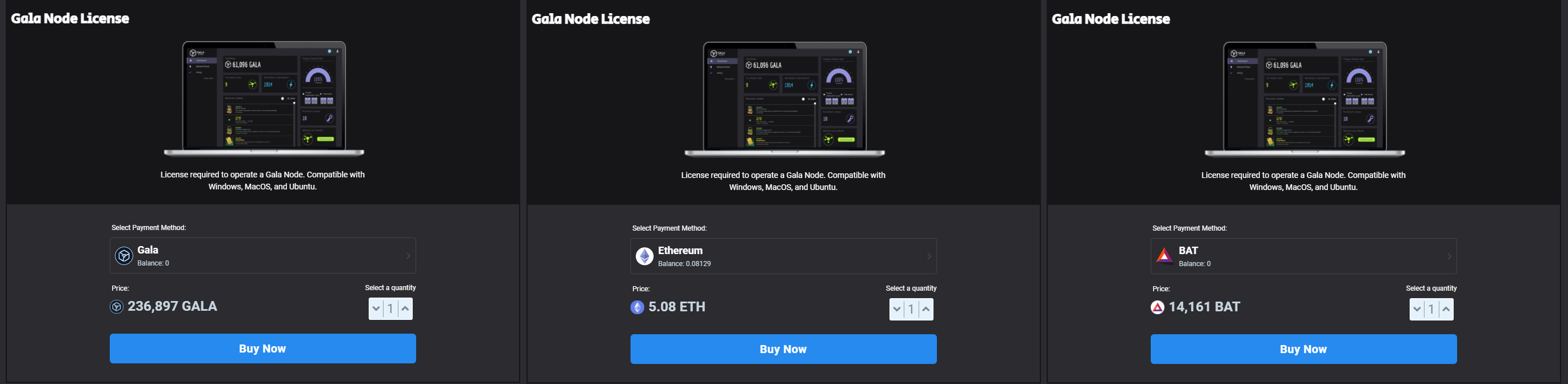 21.03.01 23:45 현재, 238,765 GALA / 4.443 ETH / 12,417 BAT 로 노드 구매 가능합니다.
