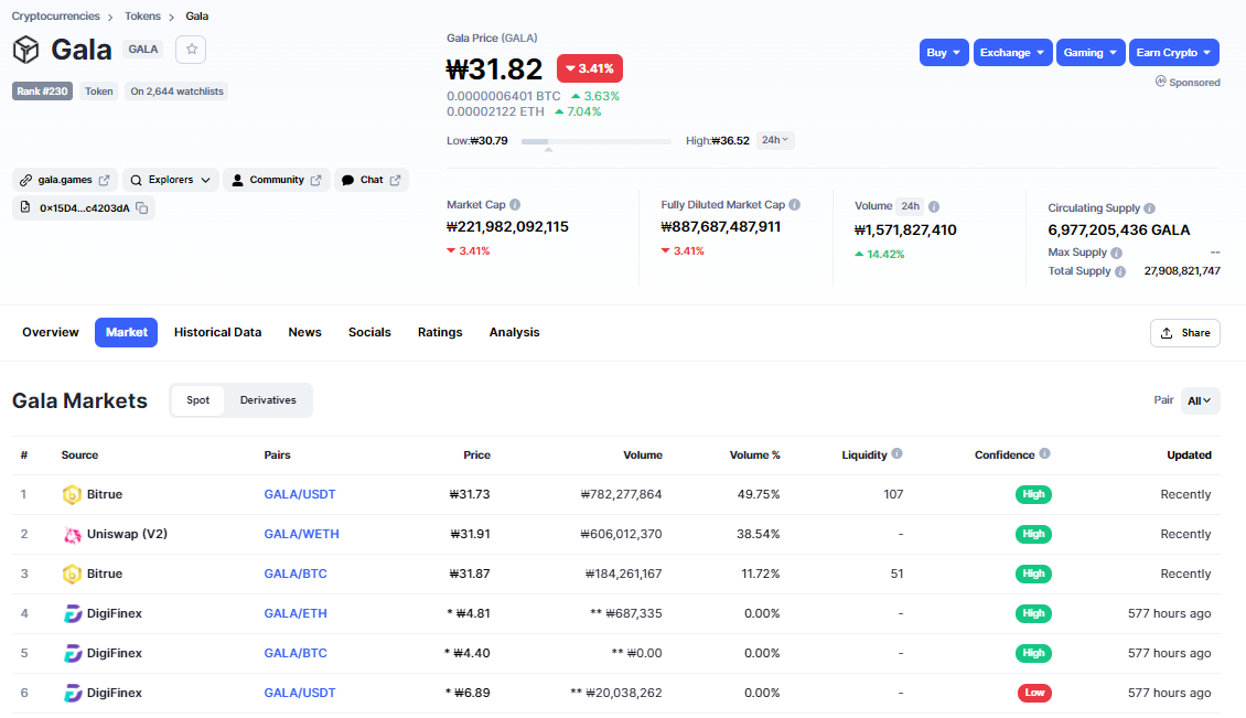 갈라(gala) 코인은 원화 약 31원 정도에 거래되고 있으며 bitrue, uniswap, digifinex 에서 거래가 되고 있습니다. (21.02.28 CoinMarketCap 기준)