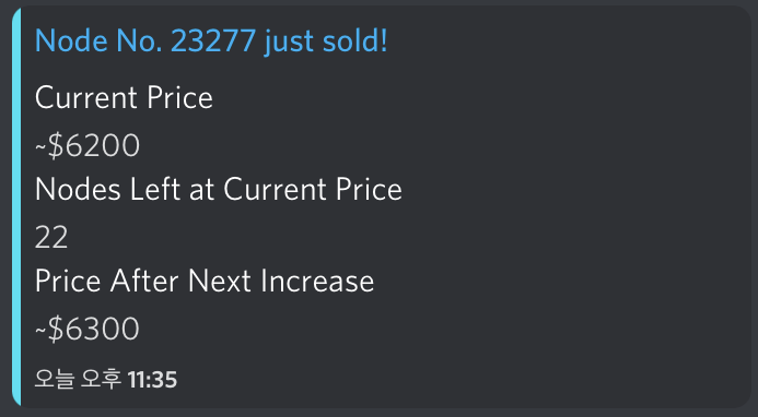 노드가 판매되면 봇이 판매 정보를 알려주는데, 보시다시피 23,277개가 팔렸고 현재는 6,200불 입니다.
