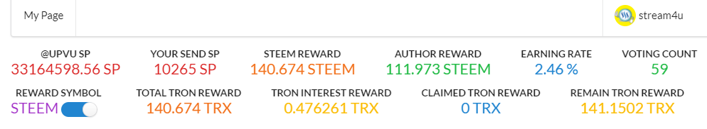 그 동안 UPVU 사이트 내에서 개인의 Tron 보상 잔여량은 계속 상승하여 몇몇 분들은 Tron 보상을 클레임 하신 분들도 계십니다.