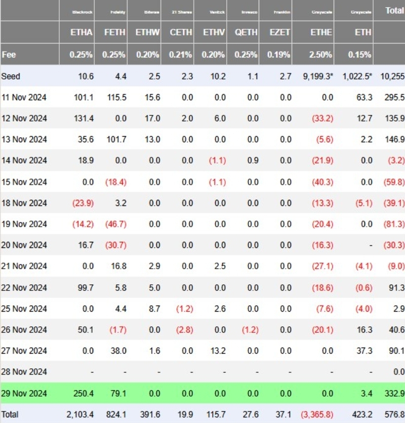 29일 코인텔레그래프에 따르면 9개의 이더리움 ETF에는 총 3억 3290만 달러가 유입됐습니다. 이는 11월 11일 기록된 이전 최고치 2억 9550만 달러를 3740만 달러 초과하는 수치입니다