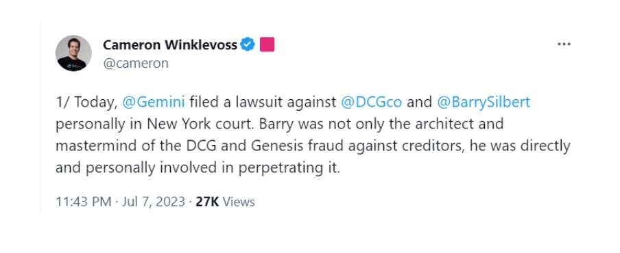 카메론 윙클보스 제미니 공동 창업자가 트위터를 통해 오늘 제미니는 디지털커런시그룹(DCG)과 배리 실버트(Barry Silbert) DCG CEO를 상대로 소송을 제기했다고 밝혔습니다