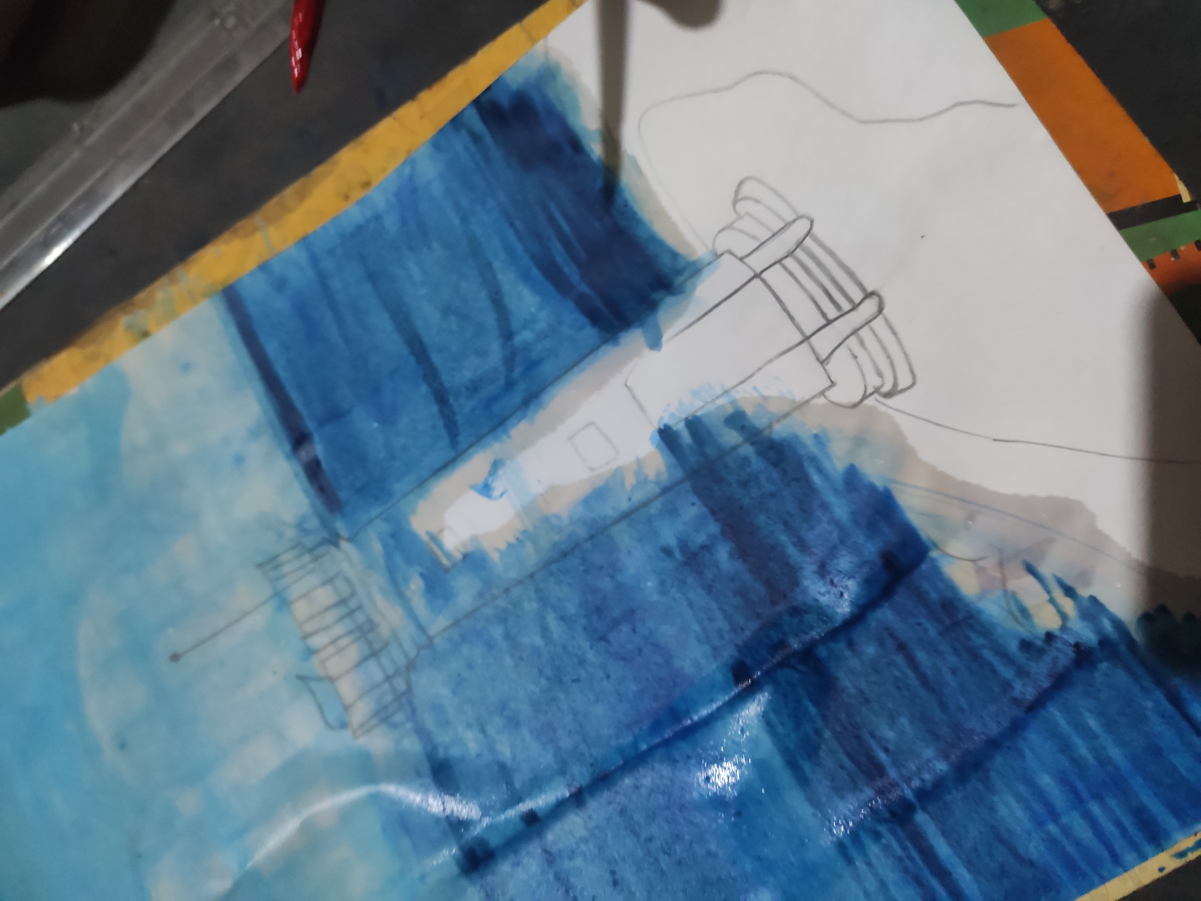 নীল রং দিয়ে সমুদ্র রং করব। ও গাঁঢ় নীল রং দিয়ে সমুদ্রটি পুরোপুরি আঁকব।