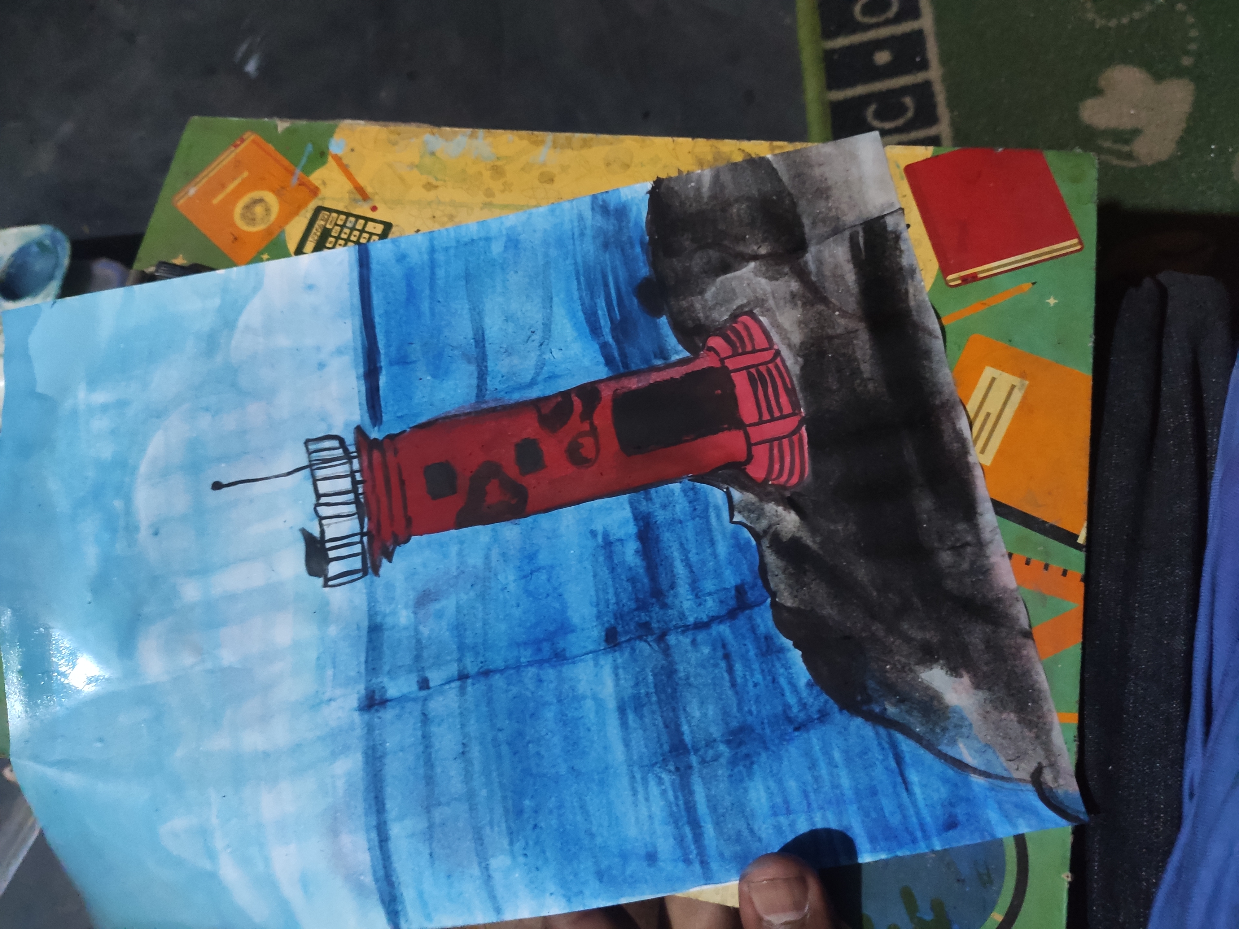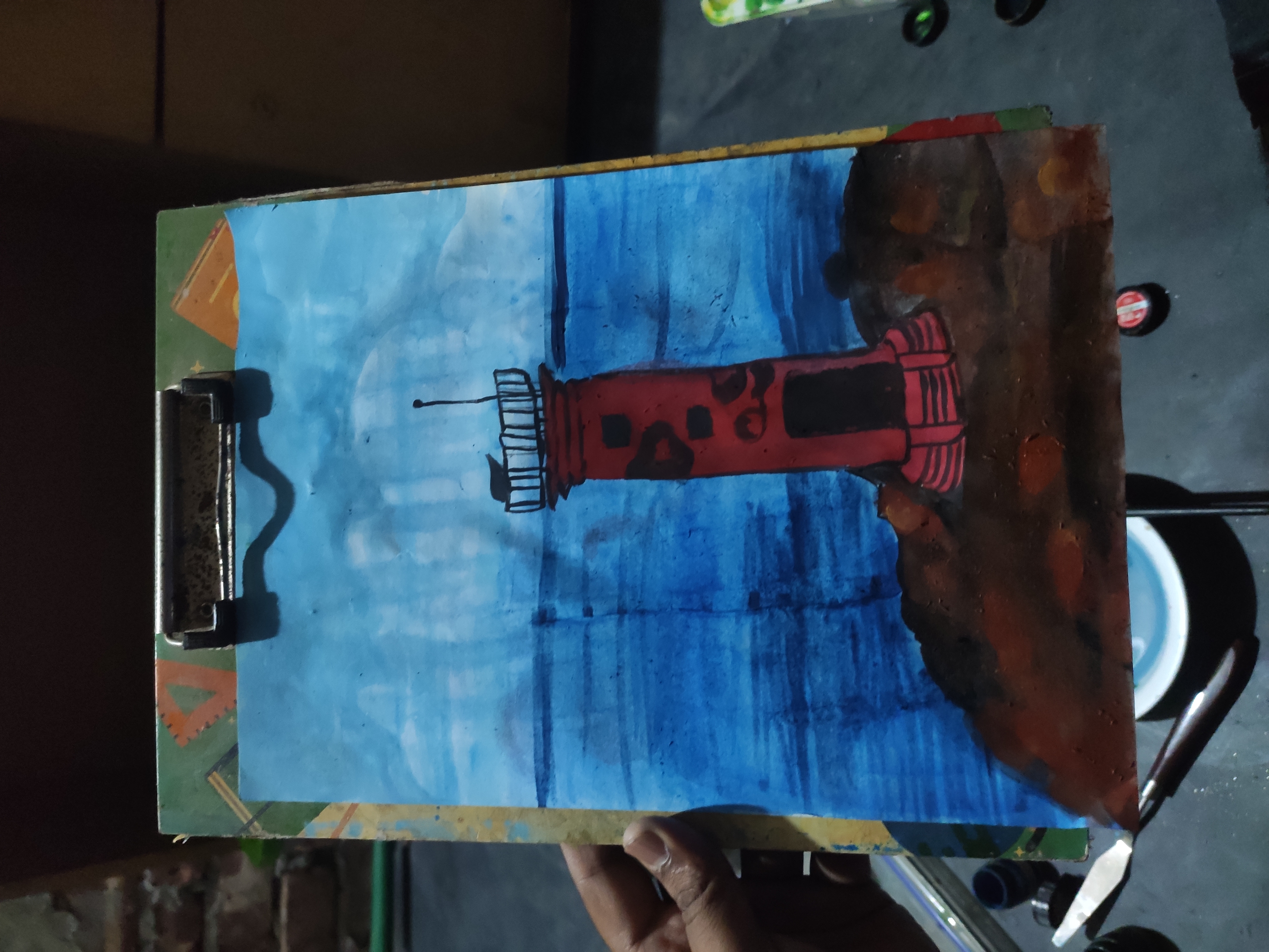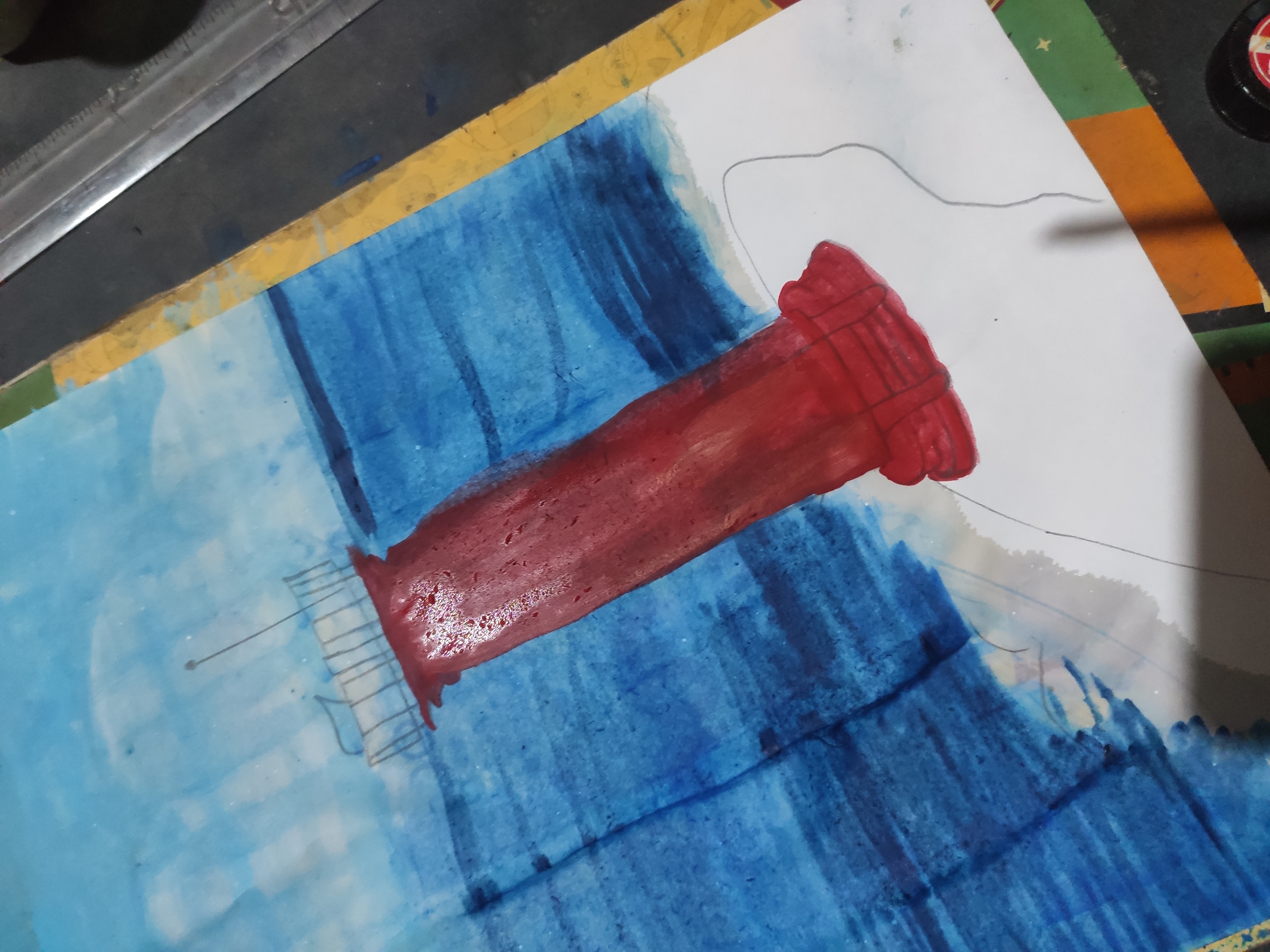 লাল রং দিয়ে লাইট হাউস টি রং করব ও কালো রং দিয়ে কিছু কিছু অংশ ফুটিয়ে তুলব।