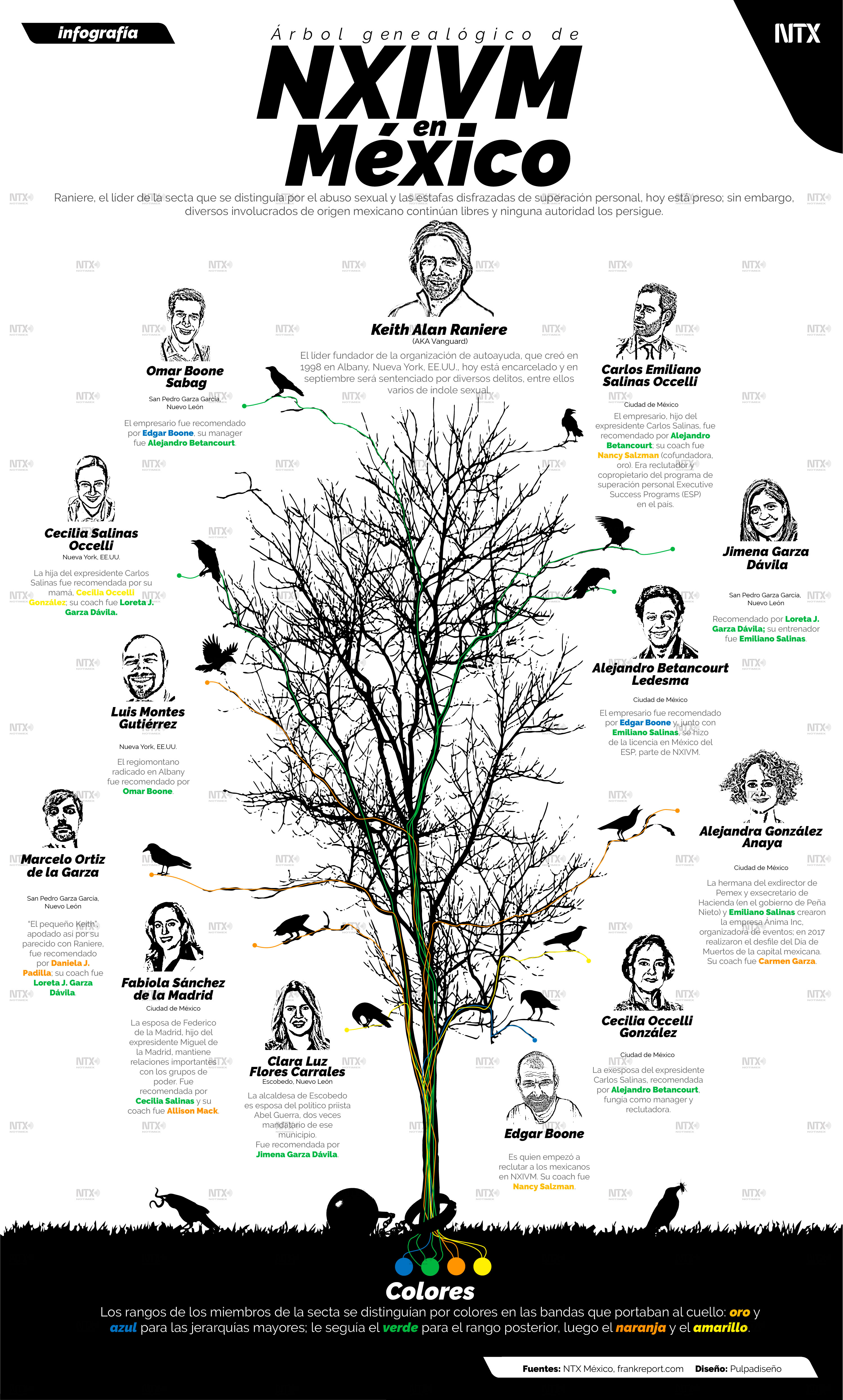 NXVIMsteemCreated with Sketch.pastrane (50)in #secta • 7 years ago Árbol genealógico de NXVIM en México, lugar tuvo un papel fundamental, pues Keith Raniere, líder de la secta, reclutó a mujeres empresarias e hijos de uno de los máximos políticos del país. #clan #culto #sexo #mexico