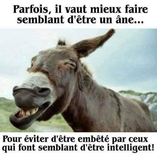 Parfois...neoradio38 (27)in #semblant • 3 years ago Parfois, il vaut mieux faire semblant d'être un âne ... #var #varois #varoise #humour #comique #rire #rigoler #ridicule #insolite #blague #rigolard #comic #humourdujour #humourfrançais #humoriste #blageur #rigolade #faire #semblant #ane #intelligent #animaux #embeter #ane #intelligent #animaux #embeter #var #varois #varoise