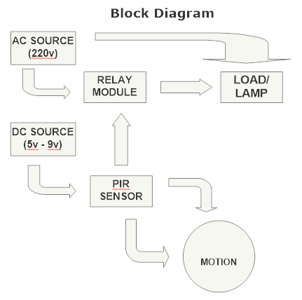 From the block diagram above, its open loop is simply from AC source to load but with only one terminal while the other is on the relay while the relay will wait the go signal from the PIR powered by the DC source. Once the PIR detects a motion or a movement it will give a feedback to the Relay and the Relay will change its pin to ON and the reason why the system becomes Close Loop and the bulb will light. Once the Relay receive a go signal from the PIR sensor it will turn ON for only 3 seconds.