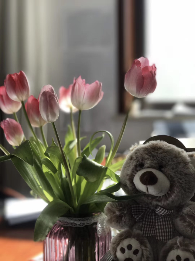 这个花市只有一条街,很快就逛完了,最后呢我只买了一束郁金香,家里还放着生日礼物收到的一只小熊。第二天带着它们去上班,摆放在自己的工位上,留下了一张照片,只是这样很简单装修的工位,却看起来赏心悦目很多。