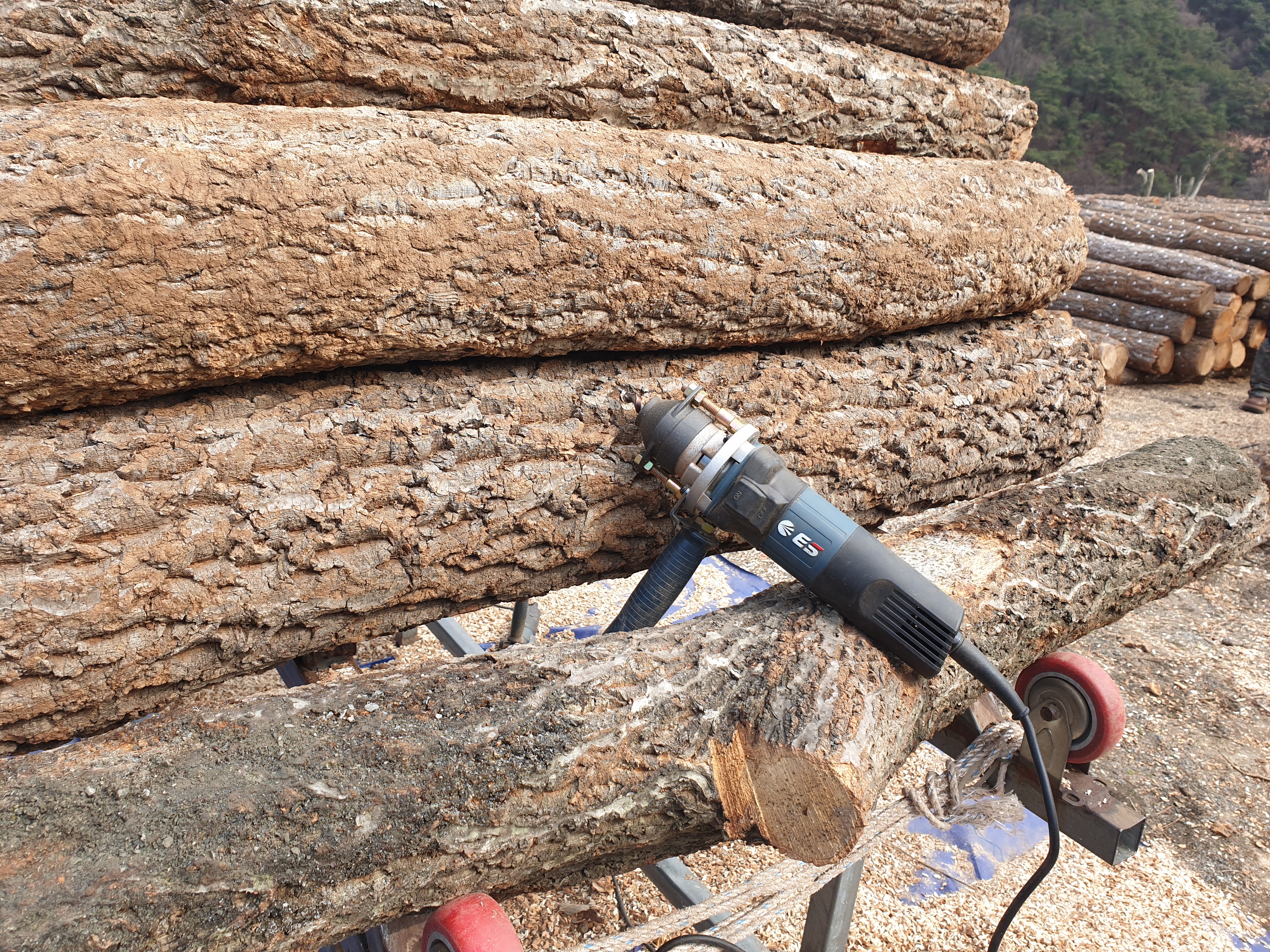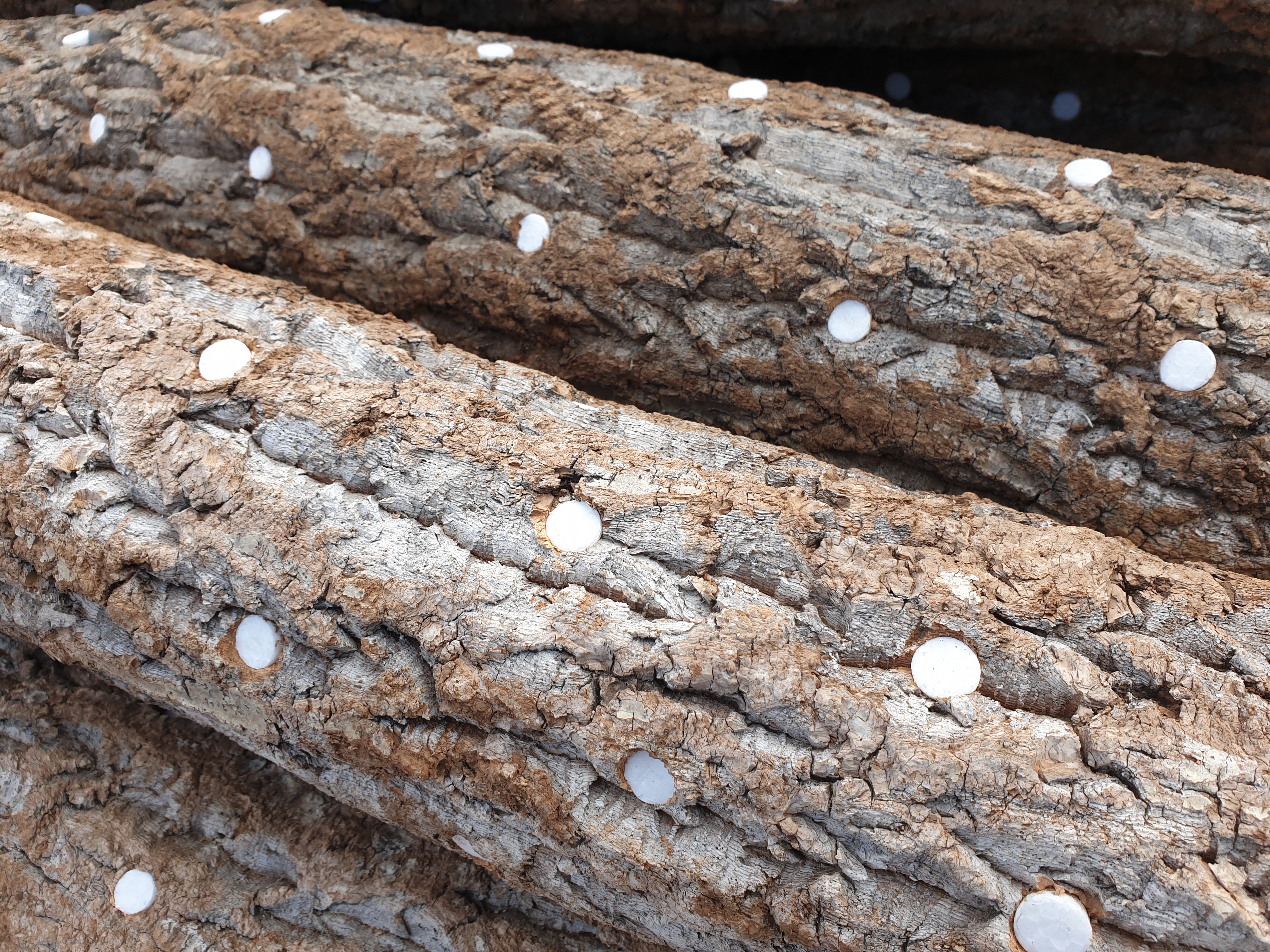 이렇게 구멍을 낸 나무에는 표고버섯 종균! 약을 넣는데요