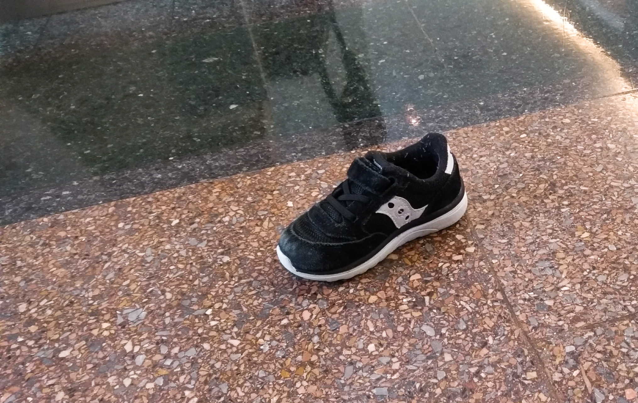 We walked from one end of the mall to the other end and were browsing different floors. And when I was going to offer him some water, I looked down at his feet, and that was when I realized he had one shoe missing!