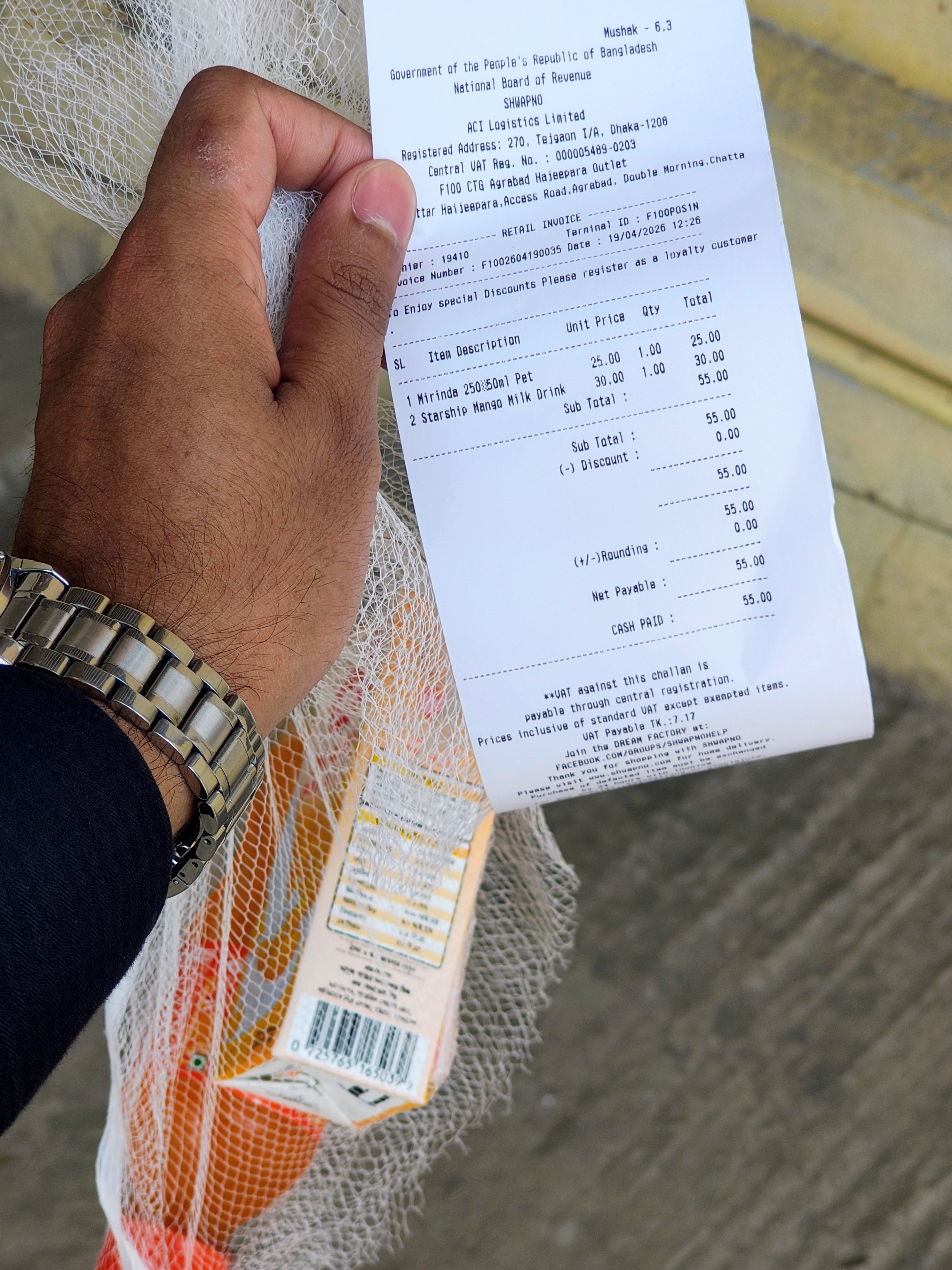 I have been completely satisfied with their service every time I’ve purchased something from Shwapno. As I mentioned earlier, even if I buy a product worth just 1 Taka, they provide it with a packet and a money receipt; in other words, they always maintain their quality. The mango milk and juice I bought were from a very recent production batch, and the taste was extraordinary. I am attaching the money receipt of the products below.