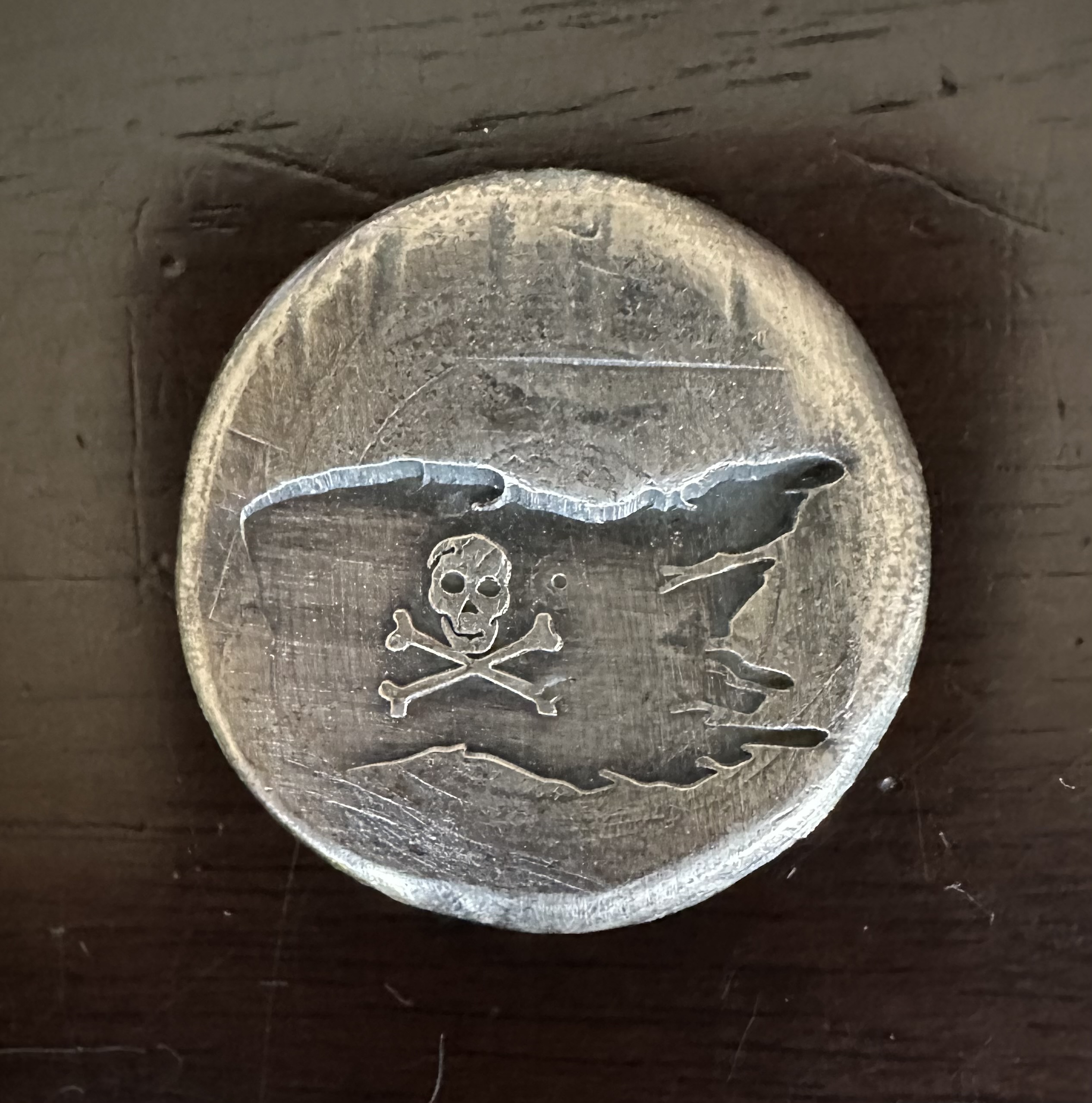 Pirate themed silver is always a hit among us stackers. This particular piece was by a local pourer, who used a basic, premade stamp to form the Jolly Roger flag, which is flown from pirate ships of old.