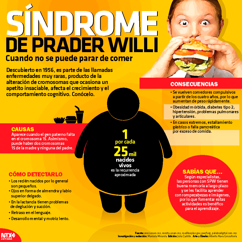 El síndrome de Prader-Willi (PWS) es una enfermedad genética caracterizada por obesidad con hipotonía e hipogenitalismo, acromicria y retraso mental. La hipotonía es severa en la época neonatal, conlleva infecciones respiratorias y problemas de alimentación. La obesidad se inicia entre los 6 meses y los 6 años.