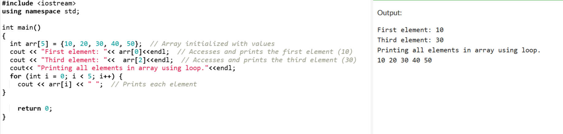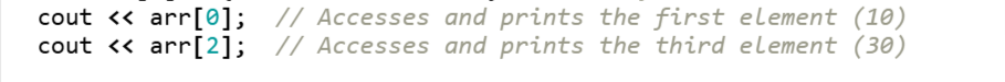 Each element of the array is accessed trough the index of the array. Each index has a memory location and it returns the memory stored in that index.