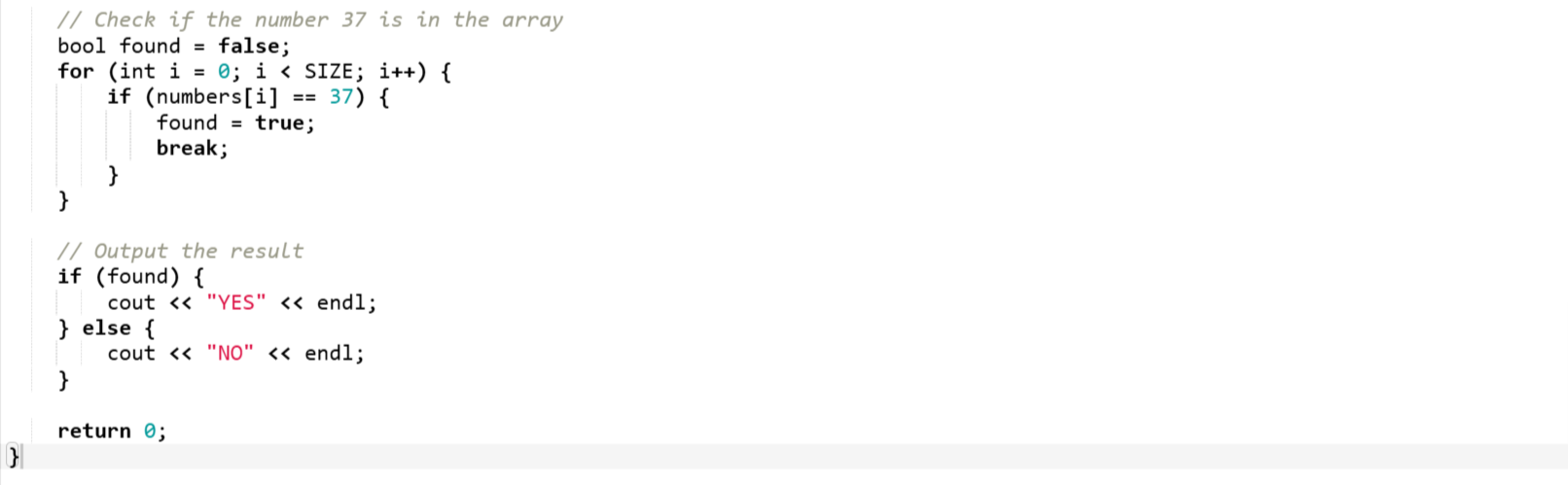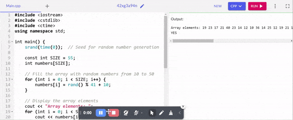 Then I have written the accessible code to display the array of 55 random numbers on the screen. Then I have defined a bool variable as found with the default value of false. Then there is the condition to check the presence of number 37 and if the number is found then the variable found is set true.