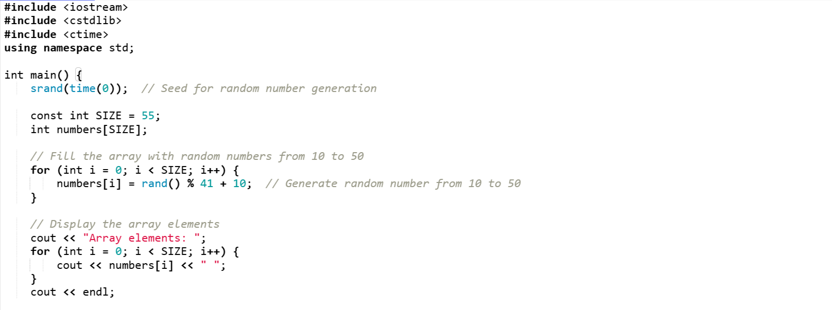 As we want to generate 55 random numbers so need a container to store those 55 numbers. I have declared an array of size 55 to store the random numbers. rand() % 41 + 10 is generating numbers from 10 to 50.