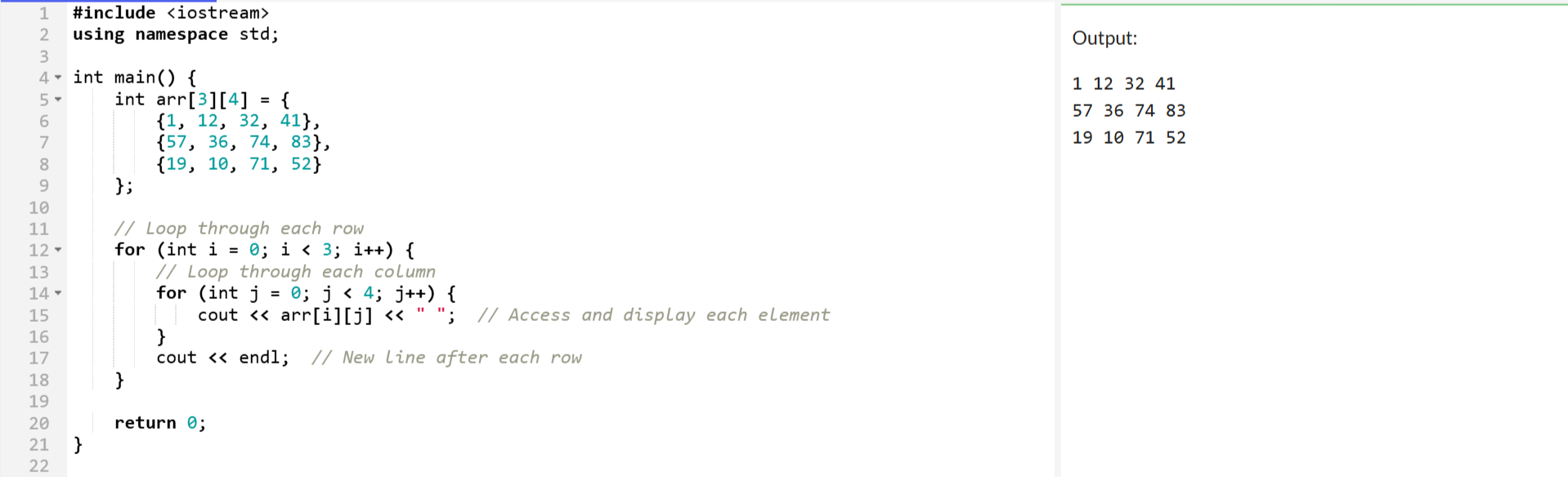 - The 2D array has 3 rows and 4 columns.