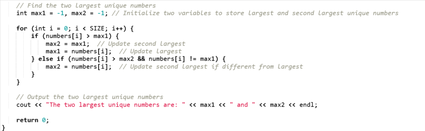 Here you can see the code is finding the two largest unique numbers by only making one pass through the array.