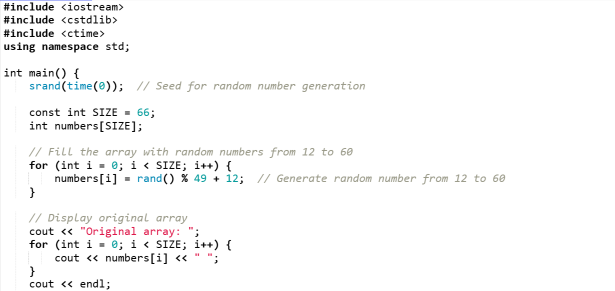At first I have initialized an array of 66 size. I have then used a for loop to fill the array with the random numbers from 12 to 60.
