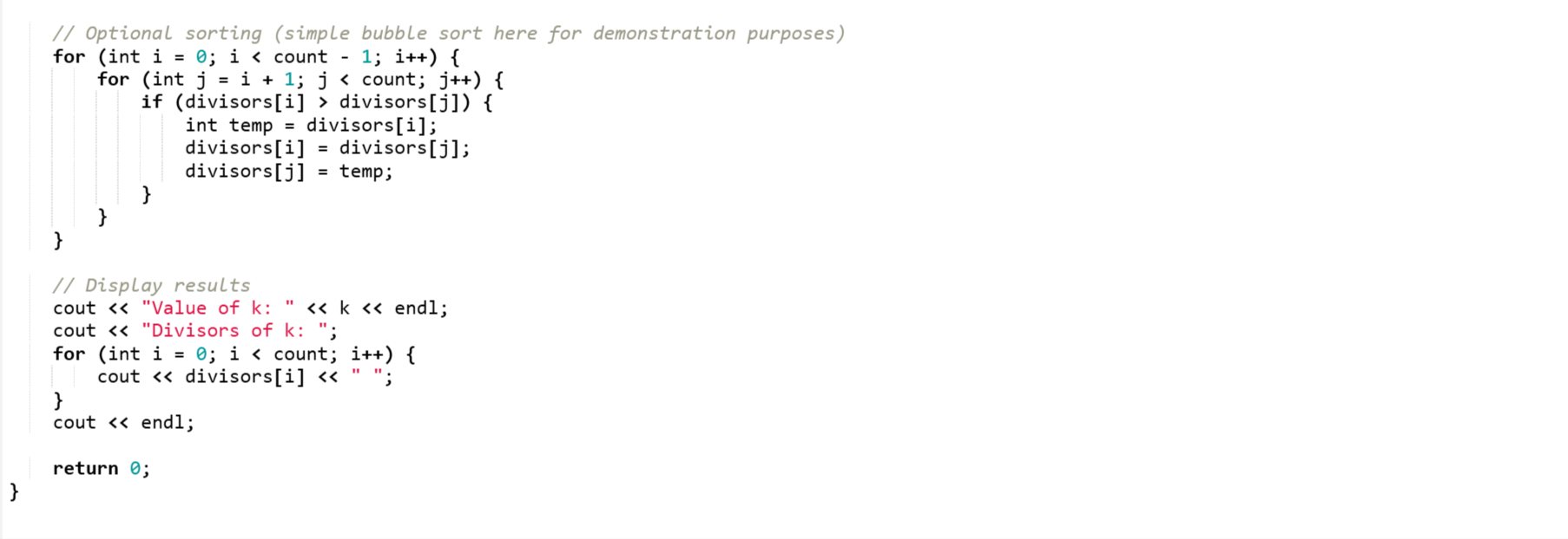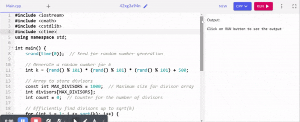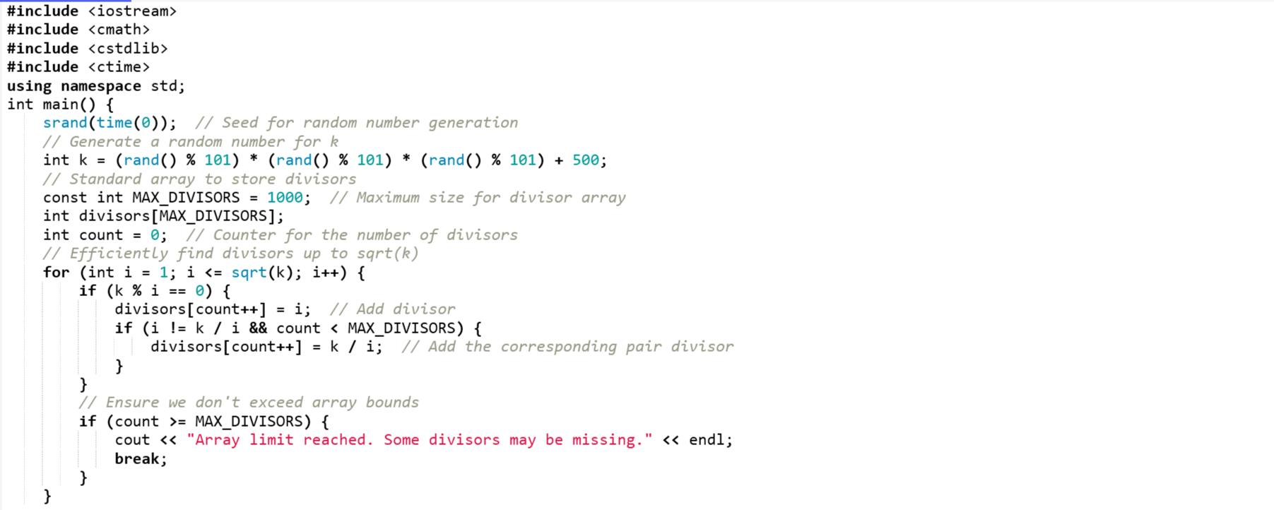 After that there is the code to find divisors of the random number efficiently. In order to find the divisor the code is only iterating up to the sqrt(k) and it reduces the number of checks to find the divisors. When a divisor i is found then we store i and k/i to capture the divisor pair.