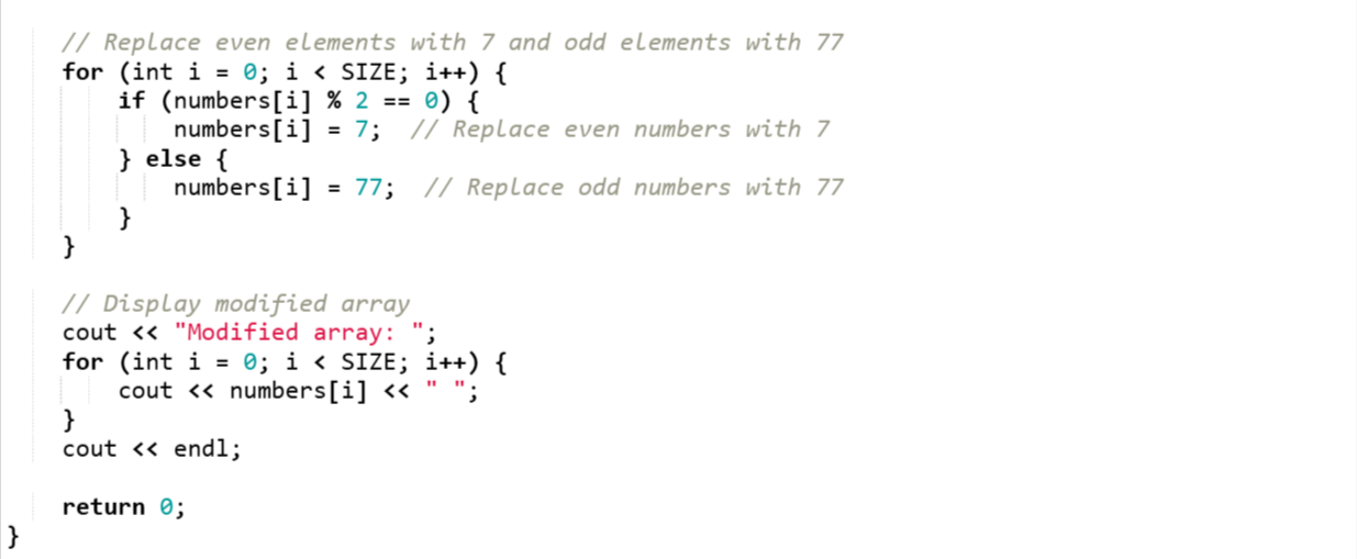 At the end of the program I have displayed the modified array after replacing even with 7 and odd with 77.