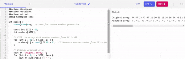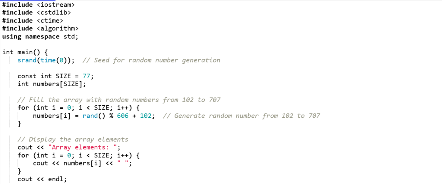 At the start there is an array which can take up to 77 numbers. Then rand() % 606 + 102 is generating random numbers from 102 to 707. Then I am printing the array with the random numbers on the screen.