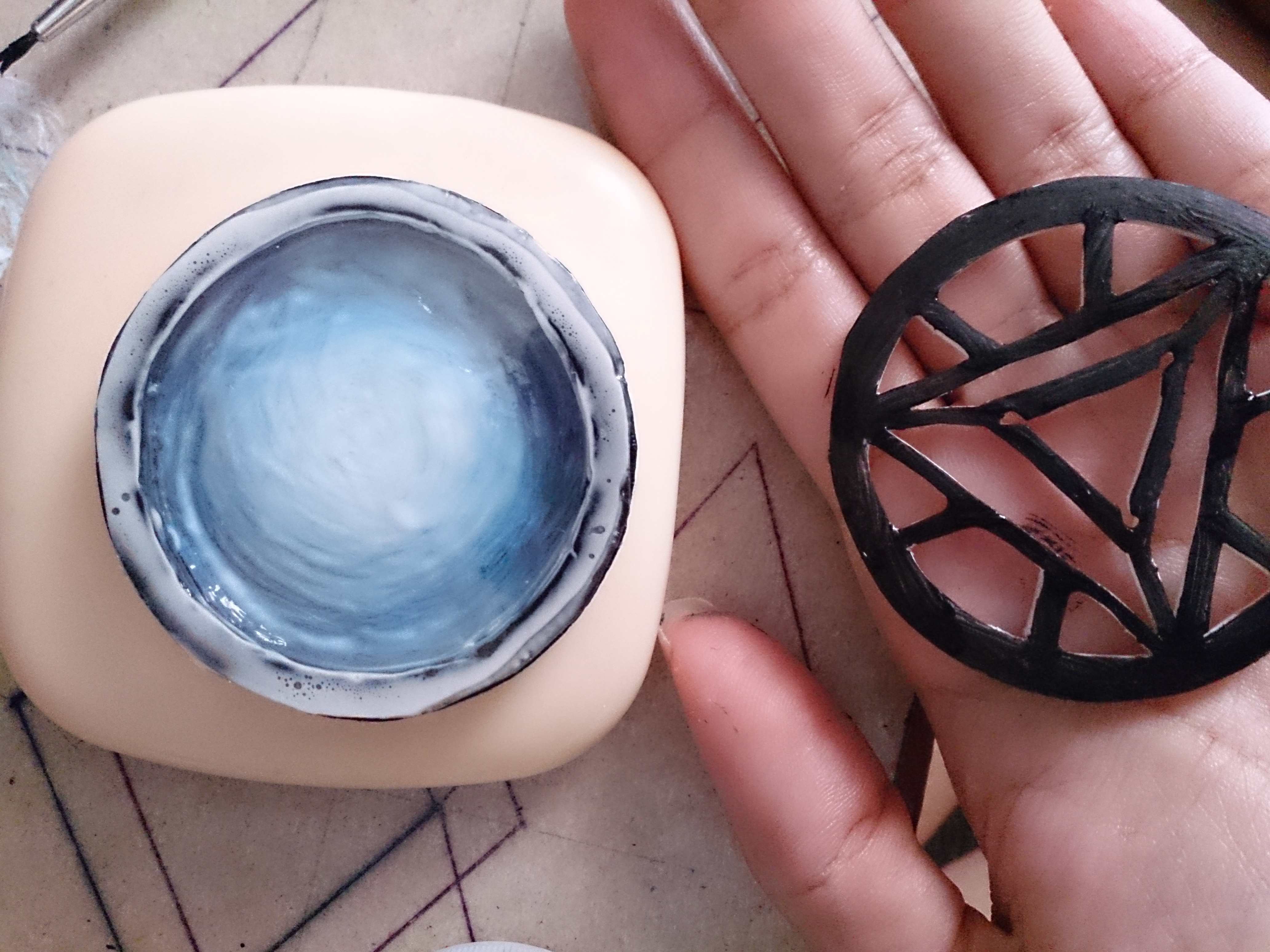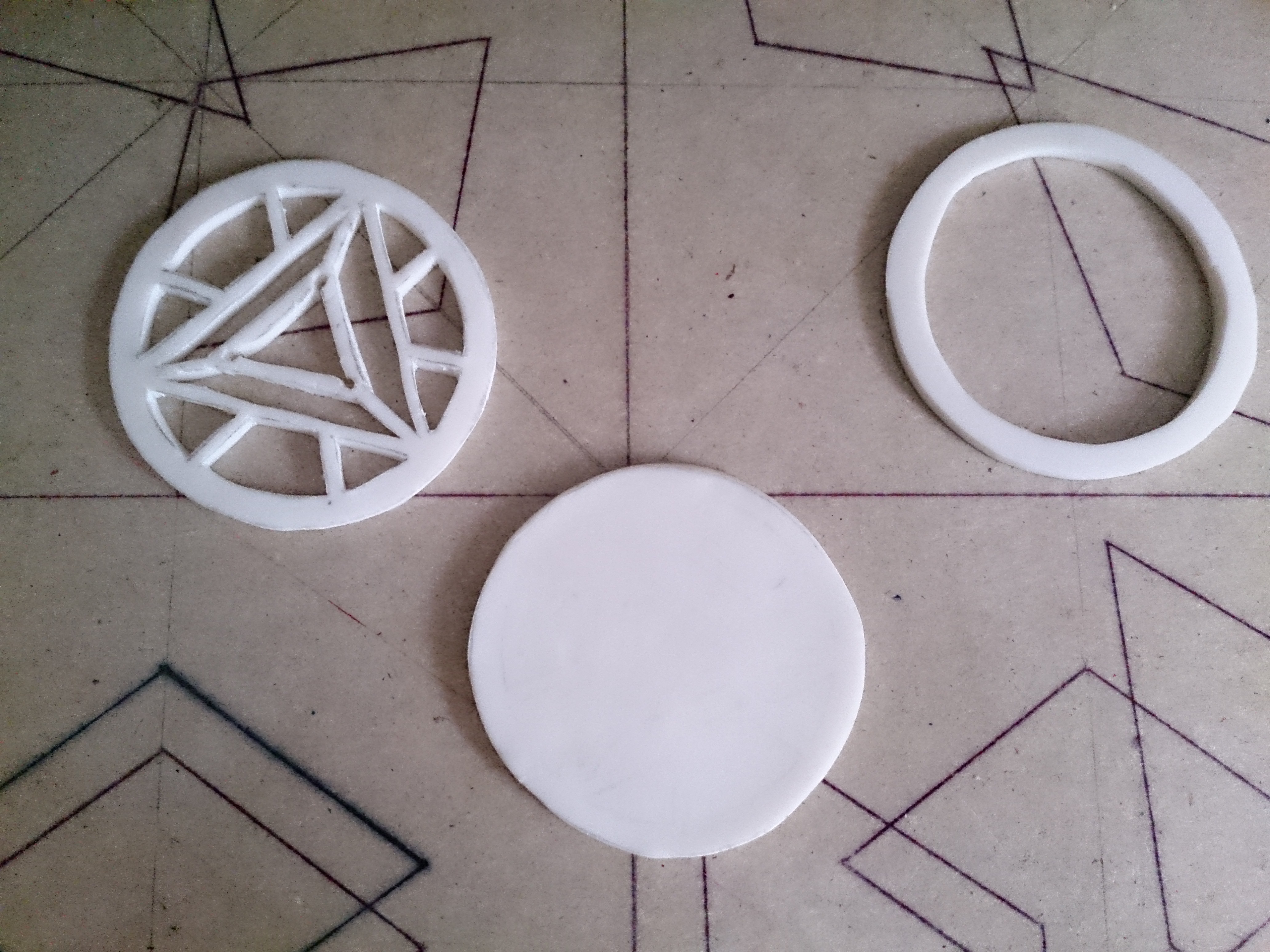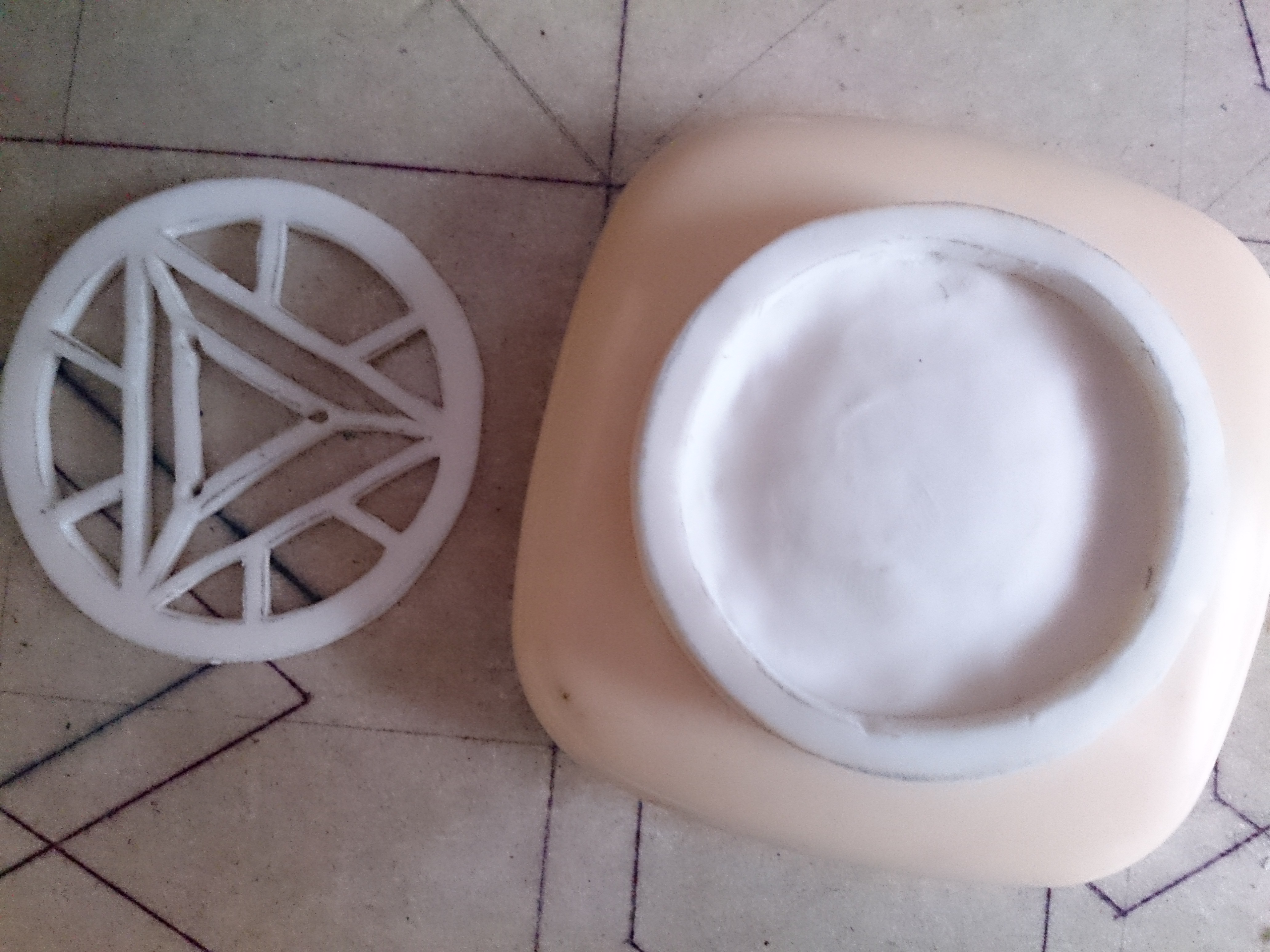 Once the drawings have been transferred to the Flexible Mass, cut the excesses of the pieces with the X-acto soaked in hand cream so that the dough does not stick to the blade, start cutting, being careful not to deform them. When the top of the reactor is cut you proceed to cut the missing pieces and join the base with the edge with a little bit of White Glue, then press the whole inner area attached to the edge to create a small internal mountain.