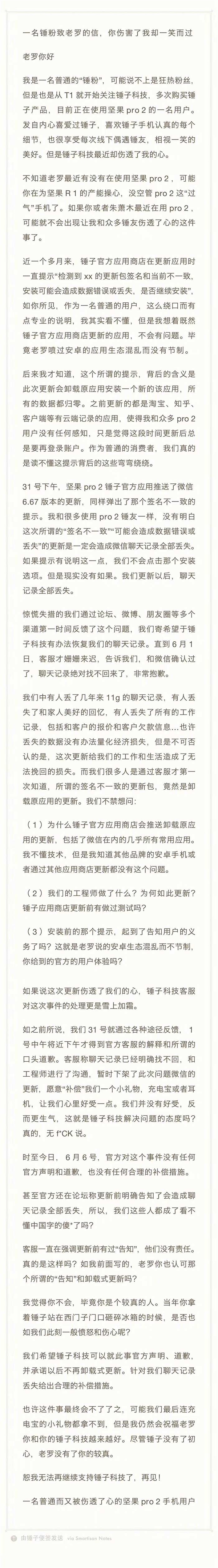 最近看到一篇名为《锤子坚果Pro 2更新微信聊天记录丢失 用户发公开信称无法再支持》的文章(来自https://www.cnbeta.com/articles/tech/735189.htm)