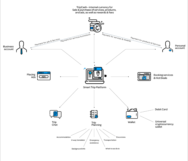 The blockchain technology for travel business is the "Smart Trip Platform". The main goal of the Smart Trip ecosystem is to create a link between travelers and travel agencies and would at the same time provide its users with all the advantages of blockchain technology.
