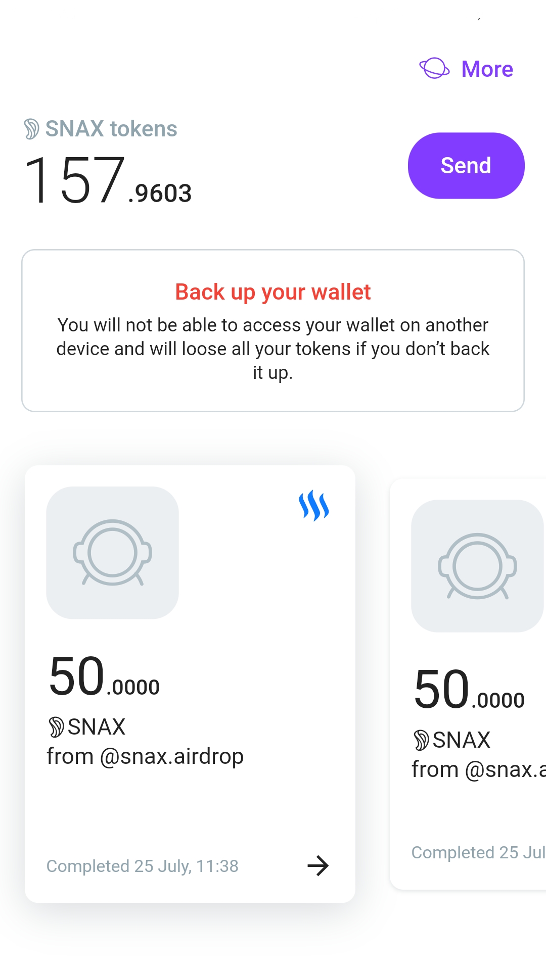 Cool, installed the app, will send a screenshot. Noticed that the transactions do not show up, gone into oblivion. Sending SNAX is fast though. Great how it integrates with Steem, showing the account image.