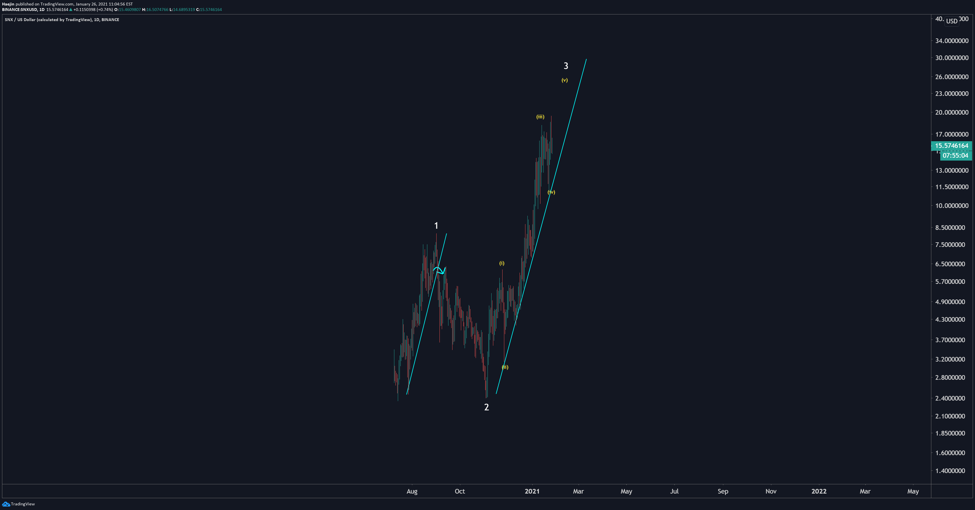 SNX: Strong Trendline!munsters (84)in #snx • 5 years ago Strong trendline support! Subwaves of white 3 shows that yellow (v) is still probably missing. Until that blue line breaks to downside, hold longs and buy dips towards it.