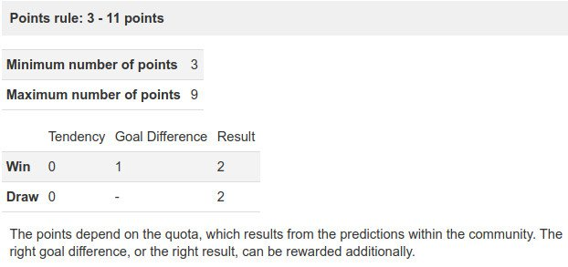 I have chosen dynamic odds when I created the soccer competition, that means the odds may change at any time before the start of the events, depending on the predictions of the participants. If, for example, almost all players believe that Bayern Munich will win for sure, each participant will only receive three points for a correct tendency prediction in the event of a Bayern victory, but nine points for a correct tendency prediction on the opponent (the exact rules description can be found in the announcement post).