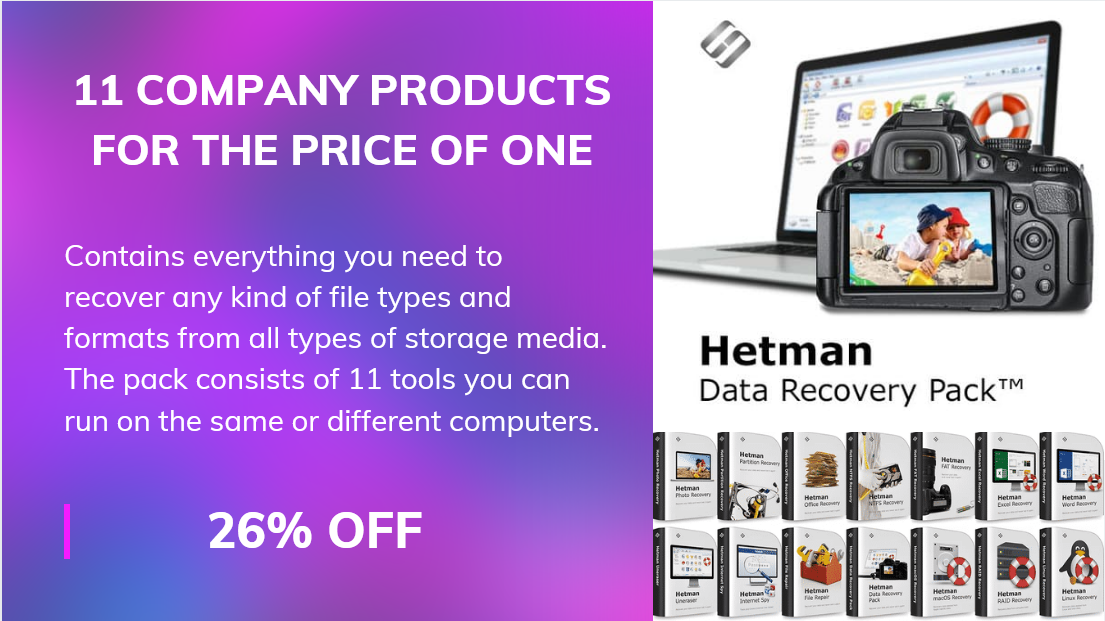 Hetman Data Recovery Pack - contains everything you need to recover any kind of file types and formats from all types of storage media.