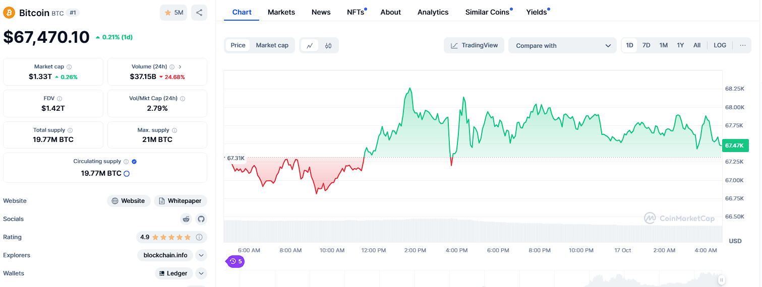 Der aktuelle Bitcoin-Preis liegt bei $67,470.10, mit einem leichten Anstieg von 0.21% innerhalb der letzten 24 Stunden. Das Handelsvolumen beträgt $37.15 Mrd., jedoch mit einem Rückgang von 24.68%. Die Marktkapitalisierung ist bei $1.33 Billionen, was Bitcoin weiterhin als dominierenden Akteur im Kryptomarkt positioniert.