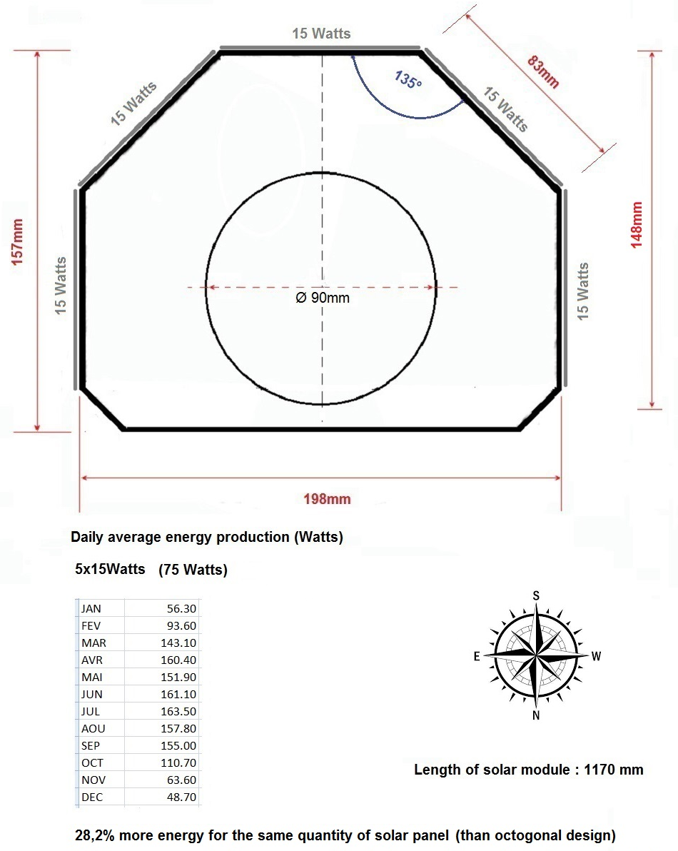 The octogonal design works pretty fine after 3 years experiment in center of France (Mont Saint Vincent). 3 vertical modules of each 80W, and a small panel of 60W on the top. Installed with a 600W LiFePO4 battery and a LED street light of 20W (210 lumens/Watt).