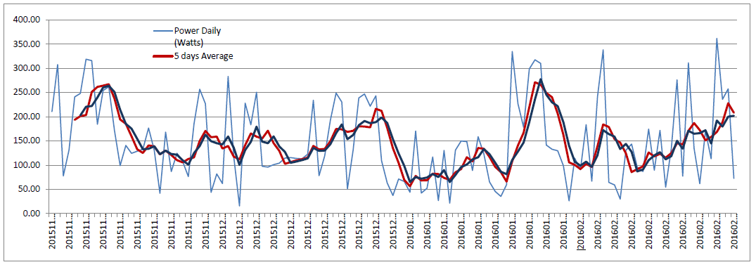 Daily power generated in winter between november and february by our octogonal solar street light mounted in center of France :