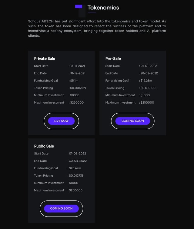 Solidus AITECH has put significant effort into the tokenomics and token model. As such, the token has been designed to reflect the success of the platform and to incentivise a healthy ecosystem, bringing together token holders and AI platform clients.