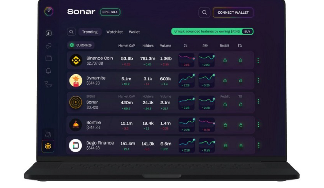- The Sonar dashboard can be accessed by anyone, making it a transparent open ecosystem. Users can analyze progress and research to make decisions to be used in their portfolios with different functional bases, so they provide owners with more benefits compared to the main Sonar currency, offering more benefits like access to exclusive features, removal of ads, notifications, data customization, advanced charts and more. Not only that, holders get an option income stream that allows them to receive rewards and analysis at the same time.