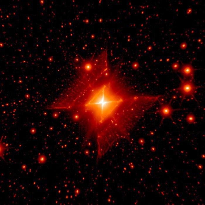 Such symmetrical angular geometric shapes are very unusual for nebulae. This nebula is probably generated by a binary star system, and both stars have ejected cones of matter in opposite directions. These cones have right angles at the base, and they are turned sideways to the observer. In support of the cone hypothesis, you can specify radial spokes that run from the center of the image. They probably run along the walls of the cones. They would also have merged into a ring if the nebula had turned its other plane toward us.