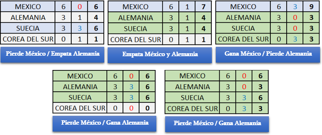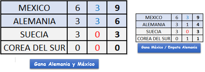 Queda solo 2 partidos por disputar en este grupo, Suecia - México y Alemania - Corea del Sur. Según este cuadro lo mejor que le puede pasar al equipo Alemán es que México le gane a Suecia PRIMERAMENTE, luego tienen que poner de su parte para ganarle a Corea del Sur o por lo menos lograr un empate para así asegurar su pase a la siguiente ronda.