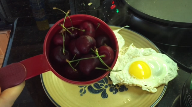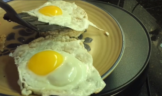 - Cuando los huevos estén listos los pasamos a un plato colocabdolos encima de las tortitas. También le pueden colocar a las galletitas mermelada natural sin azúcar. Yo preferí comerlas con así.